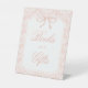 Entdecken Sie unsere herrliche, junge Dusche mit diesem hübschen "Bücher und Geschenke"-Zeichen im Coquette-Stil. Mit einem eleganten Böhmerbogen in Pastellrosa und niedlichem Band-Rahmen und Damast-Muster im Rücken.