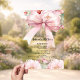 Der helle, durchsichtige Hintergrund ist mit einem rosa großen Bogen und goldfarbenen Kreuz und rosa Blume geschmückt. Personalisieren und fügen Sie einen Namen und Details.