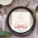 Creme, beige Hintergrundfarbe. Die Einrichtung besteht aus einem großen rosa Bug und einem goldenen Kreuz. Personalisieren und fügen Sie den Namen, das Datum und den Text hinzu.