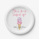 Whimsical Eis Thema Brautparty Papiertafel mit Aquarellbild von rosa und lila Eisschleifen auf einem Waffelkonus. Im Text steht: "Sie wurde aufgefangen!" Ideal für ein Brautparty oder einen Polterabend im Sommer.