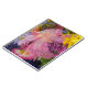 Ein hübscher rosa Engel, der ein Kind über einem Blumengarten trägt.