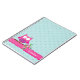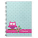 Personalisiertes Notizbuch, das eine kleine rosa Cartooneule sitzt auf einer Niederlassung mit Grün-Blätter und Blumen des heißen Rosas und Aquapolkapunkten kennzeichnet. Niedlicher und Spaßentwurf für für Mädchen. Kundengerechtes Namensgeschenk