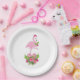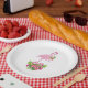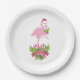 Papier Teller mit einem tropischen Thema Weihnachtsbramingo mit einer rosa Weihnachtsmannmütze. Unter seinen Füßen befindet sich ein Bonbonbons mit hübschen tropischen Blume und rosa Beeren. Ein Gezwitscher der Heiligen auf der Brust.