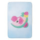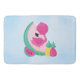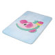 Eine Badematte mit einer niedlichen Abbildung eines rosa Flamingos mit Wassermelonen und Ananas. Rosa und grüne Farbe. Summerisch und tropisch. Der Hintergrund ist ein hellblaues Aquarellbild.