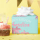 Dieses spezielle Geschenkpapier mit einem Retro-Stil rosa Flamingo-Thema auf einem aquamarinen Hintergrund. Das Bild zeigt einen Flamingo, der unter einem Palmenhain auf einer tropischen Insel stehend ist. Das Bild hat ein glamouröses rosa Folienmuster mit Glitzer-Akzenten. Ein Muster "Happy Birthday"-Begrüßung wird in einer hübschen Bubenlegum-Rosa-Farbe gedruckt, mit einem personalisierten Namen in einem rosa Skript-Schriftart gedruckt.