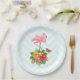 Papier Teller mit einer niedlichen digitalen Illustration mit einem rosa Flamingo mit einem Bein erhöht. Stehend auf einem Strauß mit tropischen Hibiskus Blume und Blätter. Ein hübscher Schmetterling schwebt um die Blume herum. Ein hellgrün-weiß Zickzack Muster im Hintergrund.