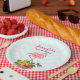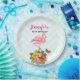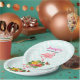 Geburtstagspapier-Teller mit einer niedlichen digitalen Abbildung mit einem rosa Flamingo mit einem Bein erhöht. Stehend auf einem Strauß mit tropischen Hibiskus Blume und Blätter. Ein hübscher Schmetterling schwebt um die Blume herum. Ein hellgrün-weiß Zickzack Muster im Hintergrund.