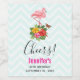 Flaschenetiketten aus Party mit einer niedlichen digitalen Abbildung mit einem rosa Flamingo mit einem Bein. Stehend auf einem Strauß mit tropischen Hibiskus Blume und Blätter. Ein hübscher Schmetterling schwebt um die Blume herum. Ein hellgrün-weiß Zickzack Muster im Hintergrund.