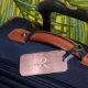 Dieses schicke Gepäckanhänger-Design mit hübschem, rosafarbenem Glitzer auf einem rot-rosa gebürsteten metallischen Hintergrund ist einfach zu personalisieren.