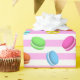 Farbenfrohe Macarons auf rosa und weiß gestreiftem Hintergrund.