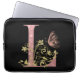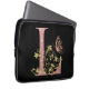 Hübsch rosa Glitzer initial / buchstabe L mit goldenen Blätter und Wirbel und kopperfarbene Schmetterlingsüberlagerung auf schwarzem Hintergrund