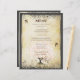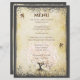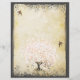Whimsical Magical Tree of Liebe Pink Heart Leaf Tree on Tea Gestaltete warme Silver Toned Metallic Paper mit einem Overlay von Antique Sheet Music und einige niedliche kleine Wirble Designs, um die Wurzeln der Liebe auf dieser einzigartigen Waldland Hochzeitseinladung zu erhöhen..