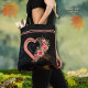 Personalisierte rosa Heart Tote Tasche auf dunkelschwarzem Hintergrund mit grünen und rosafarbenen Tönen und schön gearbeiteten rosa Rosen. Wenn Sie ein Valentinstag-Geschenk suchen, können Sie den Namen auf der Tasche aktualisieren und eine Valentintagskarte in der Valentinerkarte und Geschenksammlung finden. Es wäre ein großartiges Valentininsgeschenk für deine Freundin, Schwester oder Liebhaber