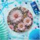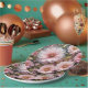 Zarte, rosa Kosmos-Blume mit dünnen, durchsichtigen Blütenblättern werden zusammengefasst, umgeben von goldenen Blätter auf schwarz