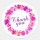 Moderne abstrakte Aquarellfeder leuchtend rosa lila Kranz danken Ihnen für das Kommen oder Gönnen Hochzeitsaufkleber oder Gelegenheitsaufkleber. Teil des hellrosa Stiefmütterchen Aquarellkranz Kunst Hochzeitskunst feststehendes Set. © Original Aquarellmalerei und Design von Sarah Trett. www.sarahtrett.com für www.mylittleedenweddings.com
