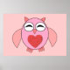 Dieses Poster zeigt einen niedlichen Cartoon einer rosa Eule mit schläfrigen Augen, einem kleinen Schnabel und niedlichen kleinen Füßen. Die Eule hat ein großes Herz aus roter Liebe inmitten ihres Bauches und die Flügel sind weit offen, um jemanden zu umarmen.