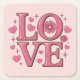 Dieser rosa Untersetzer zeichnet sich durch ein typografisches Design des Wortes LIEBE in rosa Buchstaben mit einer goldenen Kontur aus. Der Buchstabe O enthält eine rosa Blume mit 8 Blättern. Es gibt rosa Blume, Herz und vier spitze Sterne rund um das Wort LIEBE. Der Hintergrund ist eine solide hellrosa Farbe. Die rosa Buchstaben sind glänzend. Der Untersetzer ist ein Untersetzer aus viereckigem Zellstoff. Es sind sechs Untersetzer im Untersetzer Set.