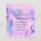 Eine mädchenhafte und weibliche 18. (oder jedes Alter) Geburtstagsfeier Einladung. vorne: Ein holografischer Hintergrund in lila, rosa. Dekoriert mit rosafarbenen Konfetti. Personalisieren und fügen Sie einen Namen und Party-Details hinzu. Der Name wird mit einem handgeschriebenen Stilskript geschrieben, lila Buchstaben. 1 Blatt = 1 Einladung mit Druckkante bis Kante.