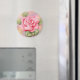 Runder 2,24" Magnet mit meinem Bild einer rosa Rose mit weichem blau, lavender und gelbem Hintergrund.