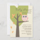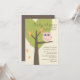 Einladungen für die Girl-Babydusche, von Red_dress, mit einer Herbstszene mit grüner Baumillusion, braunem Baumstamm, fallendem Blätter / orangefarbenen Blätter und niedlichen rosa Eule auf einem braunen Zweig, auf beige / ecru Hintergrund gedruckt.