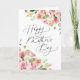 Elegante, blumengeschmückte Muttertagskarte mit rosa Aquarellen, Rose, Dahlien und Hydrangeas mit lebhaften grünen Blätter an den Ecken des Designs. "Muttertag des Glücks" wird auf der Vorderseite in der modernen Kalligraphie gezeigt. Die Innenseite der rosa Muttertagskarte zeigt Ihr vertikales Foto mit Platz für eine typisierte oder handgeschriebene Nachricht an.