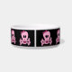 Diese kundenspezifische Keramikhaustierschüssel hat miserabelen rosa girly Schädel und gekreuzte Knochen. Es wird um den Teller wiederholt. Es ist mit einem rosa Bogen auf dem Schädel rosa. Die Mitte hat Raum für den Ihren Namen des Haustieres in der Schablone. Klicken fertigt besonders an, um die Hintergrundfarbe oder -Schriftart zu ändern.