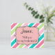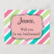 Rosa Regenbogenstreifen sind der perfekte Weg, um jemanden zu einer Brautjungfrau für Ihre Hochzeit einzuladen. Mit einem rosa, grünen und blau gestreiften Hintergrund ist "Will you be my bridesmaid" in einem rosa Rahmen mit anpassbaren Vorlagen personalisiert. Die Rückseite der Postkarte ist blau. Bestellen Sie noch heute Ihre Bestellung! Postkartendesign: Weddingsby Rhodie Artwork erstellt von: AMBillustrations http://www.etsy.com/shop/AMBillustrations/ Rosa Rahmen: Prettygrafik design