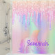 Ein angesagter holografischer Hintergrund mit Einhorn- und Regenbogenpastellfarben in Rosa, lila, Rose Gold, Minzgrün. Dekoriert mit Imitaten Glitzer Tropfen in Rose Gold, Rosa und lila und ein Regenbogen gefärbt Einhorn. Personalisieren und fügen Sie einen Namen, geschrieben mit einem mädchenhaften modernen handgeschriebenen Stil Skript. Lila Buchstaben.
