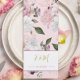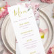 Hochzeitliches Rosa und Gold Modernes elegantes Hochzeitsmenü. Ein maßgeschneidertes Wedding Menu Design mit Ihren Informationen leicht zu ändern, um Ihre Hochzeitsfeier zu personalisieren. Persönliche Hochzeit stationär von Chessie's Fine Designs.