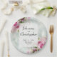 Diese wunderschönen Teller machen Ihren Hochzeitsempfang zu einem ganz besonderen Erlebnis. Diese Teller, die als Teil unserer Hochzeitssuite in rosa Rosen entworfen wurden, zeichnen sich durch ein hübsches und dennoch klassisches Design aus, das durch einen rosa Rosenstrauß auf blass blauen Hintergrund gekennzeichnet ist. Ideal für Zwischenmahlzeiten oder Snacks, wenn Sie etwas lässigeres als formelle Speisen gewollt haben. Das Design ist anpassbar, sodass Sie genau die richtigen Informationen eingeben können.