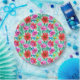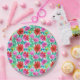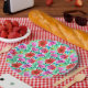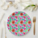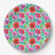 Die Teller der Geburtstagsparty sind rosa, grün, rot und lila.