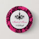 Diese moderne und trendige personalisierte fuchsienrosa, schwarz-weiße Kronleuchter-Trauzeugin mit einem rosa und schwarzen Schriftrollmuster-Hintergrund passt zu der Hochzeitseinladung unten. Der Text ist anpassbar, ebenso die Form und Größe der Schaltfläche. Wenn Sie irgendetwas ändern möchten, senden Sie bitte eine E-Mail an niteowlstudio@gmail.com.