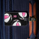 Dieses Basketball-Gepäcksack-Anhänger wurde einfach mit drei zufällig angeordneten Basketballbällen entworfen, die abwechselnd rosa, weiß und schwarz auf einem individuell anpassbaren schwarzen Hintergrund angeordnet sind - mit Spielername und Monogramm auf der Vorderseite personalisieren, Adressinformationen auf der Rückseite - von katz_d_zynes