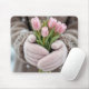 Eine junge Frau, die weiche, rosa Handschuhe trägt, hält einen Strauß rosa Tulpen in Schneeflocken