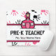 Ein Vorschullehrer mousepad, das einen Hintergrund der rosa und schwarzen handprints über Weiß kennzeichnet. Rosa Schulhauslogo in der Mitte. Text liest "Pre-K LEHRER." Personifizieren Sie mit Ihrem Namen. Look for zusammenpassende Einzelteile am rosa Schulhaus.