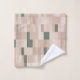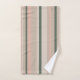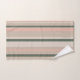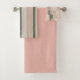 Das Badezimmer ist in Rosa und Beige-Tönen gestaltet. Das Badehandtuch ist massiv in Rosa, das Handtuch weist klassische Streifen in Beige, Grün und Rosa auf, und die Fassade ist in denselben Farbtönen gehalten.