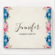 Personalisiertes Mousepad mit einem Rahmen aus rosa und blauen Wildblumen, Posen und Stiefmütterchen mit verschiedenen Zierteilen und Blätter. Farblich und hell. Die Mitte ist ein Pergamentbild aus Imitaten. Weich und sommerlich.