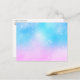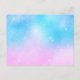 Eine Postkarte mit einem skurrilen Hintergrund. Ein pastellrosa und blaues Farbschema mit Farbverlauf. Kleine weiße Sterne verstreut herum. Whimsikisches und magisches Design.