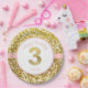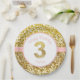 Rosa und Golddritter Geburtstags-Teller ist funkelnd und sehr hübsch. Es haben einen Goldglittery Hintergrund mit rosa Akzenten und großen "3" in der Mitte mit Raum, den Namen Ihr Kindes zu addieren.