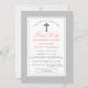 Eine klassische Eleganz mit einer Touch der modernen First Holly Communion Einladung für Mädchen. Das Design umfasst eine silbergraue Grenze, ein schönes, grau silbernes Kreuz, "Erste Heilige Kommunion" in klassischer skriptrosa Typografie, und alle Informationen über das Ereignis in dunkelgrau, auf der Rückseite Streifen Hintergrund in Rosa und Weiß. Passen Sie die bereitgestellten Vorlagenfelder an, oder klicken Sie auf Anpassen, um weitere Bearbeitungsoptionen zu erhalten.
