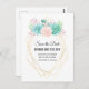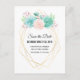 Hochzeit speichern Sie das Datum Postkarte mit einem hübschen pastellfarbenen Aquarell succulents Bouquet. Diese sukkulenten Blume, Blätter und Krawatten sind ein weiches Rosa und Grün. Ein trendiger geometrischer Rahmen mit einem goldenen Rahmen für Imitate.