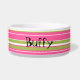 Großartiges Hundegericht in weißer Keramik und rosa und hellgrüne Streifen, um die Schüssel. Schwarzer, benutzerdefinierter Text, in der Mitte, ist bereit, für Ihre Pooch zu personalisieren. Eine tolle Geschenkidee für jeden mit einem Haustier, kommt in zwei Größen.
