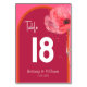 Dieses Design bietet fett rosa und orange florale Aquarellfarben florale Thema lebendige Sommer Hochzeitstisch-Karte mit eleganten Skript-Schriftart für den Namen von Paaren und sauberen Schriftart für Details.