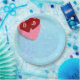 Ein großes rosa Herz mit 2 kleinen roten Herzen verbunden innen. Der Hintergrund ist eine abstrakt hellblaue Textur mit Gelb- und Grüntönen. Die schwachen weißen Herzen schmücken den Hintergrund. Personalisieren Sie mit den Paaren Initialen in kleinen roten Herzen sitzen zusammen.