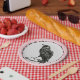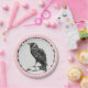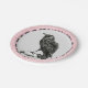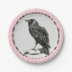 Dieses rosa und schwarze Halloween Paper Plate zeichnet sich durch ein viktorianisch rosa Damast-Design rund um den Rand aus, mit schwarz-rosa Harlequin-Muster in der Mitte, wobei ein schwarzer Rabe auf einer Sitzfläche sitzt.