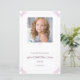 Feiern Sie die Erste Heilige Kommunion Ihres Kindes mit diesem wunderschön gestalteten Menü . Mit sanften rosa Akzenten, einem zarten Kreuz und charmanten Bugdetails in den Ecken, verströmt diese Karte Anmut und Süße. Der weiße Hintergrund verleiht dem eleganten Look eine besondere Note, während der Mix aus elegantem Drehbuch und modernen Serif-Schriftart einen zeitlosen Stil schafft. Das Foto im Zentrum erlaubt es Ihnen, eine persönliche Touch hinzuzufügen, was es zu einem hochgeehrten Sake für Familie und Freunde macht. B005