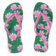Flip Flops in einem Muster von Wasserlilis in weichen Rosa- und Smaragdgrünen Lilienpolstern, die auf einem Teich schwimmen