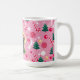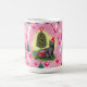 Schönes, spielerisches, fröhliches, rosa Weihnachtsdesign mit einer Illustration einer schwarzen Katze mit Weihnachtsbaum und einem Muster, das herumschwebt.