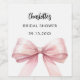 Ein weißer Hintergrund. Die Einrichtung ist mit einem großen rosa Bogen geschmückt. Personalisieren und fügen Sie den Namen der Braut und ein Datum. Schwarzes handgeschriebenes Stilskript.