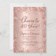 Feiern Sie stilvoll mit diesem modernen Rose Gold Glitzer "Cheers to 80 Years" Geburtstagseinladung. Dieses elegante und feminine Design besticht durch glänzende Details in der Rose mit vergoldeten Glitzer, eine anmutige Swash Schwanz Kalligraphie-Skript und einen sanften, rot-rosa metallischen Hintergrund. Ideal für eine glamouröse 80. Geburtstagsparty oder ein Meilenstein - leicht anpassbar für eine 30., 40., 50., 60. oder sogar 70. Geburtstagsfeier.